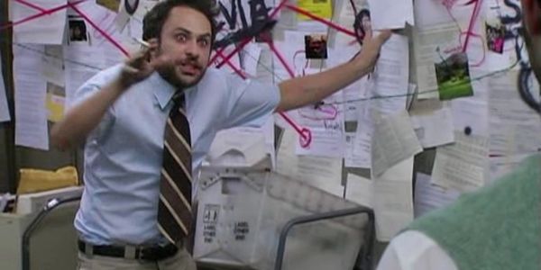 An evidence board (or "crazy wall") is a common background feature in thriller and detective fiction movies and TV. It features a collage of media from different sources, pinned to a pinboard or stuck to a wall, and frequently interconnected with string to mark connections.